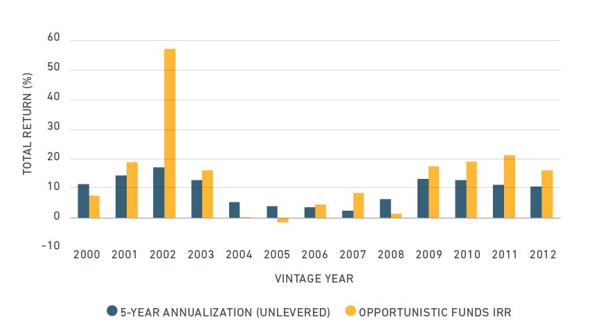 Source: MSCI Global Intel PLUS (unlevered returns) and Preqin Ltd (opportunistic funds). The 2002 vintage Preqin data is skewed by the performance of one fund with an IRR in excess of 200%. The median IRR for this vintage was 18.8%.