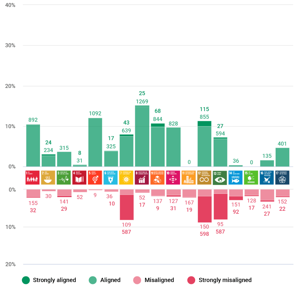 - Goals 7 (clean energy), 12 (sustainable consumption and production) and 13 (climate action) had the highest percentage of companies (8%-9%) misaligned with the goals, driven mostly by continued reliance on fossil fuels.