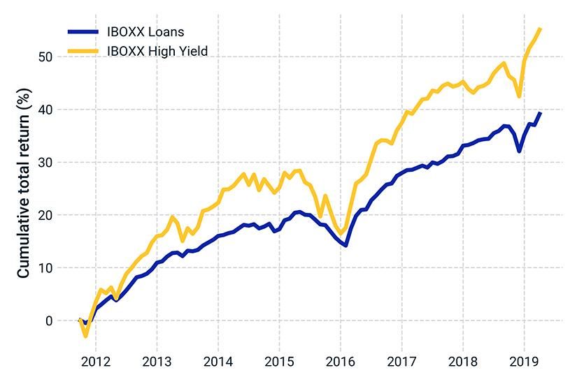 U.S. high-yield bonds represented by IHS Markit's iBoxx USD Liquid High-Yield Index; U.S. leveraged loans represented by IHS Markit's iBoxx USD Liquid Leveraged Loan Index.