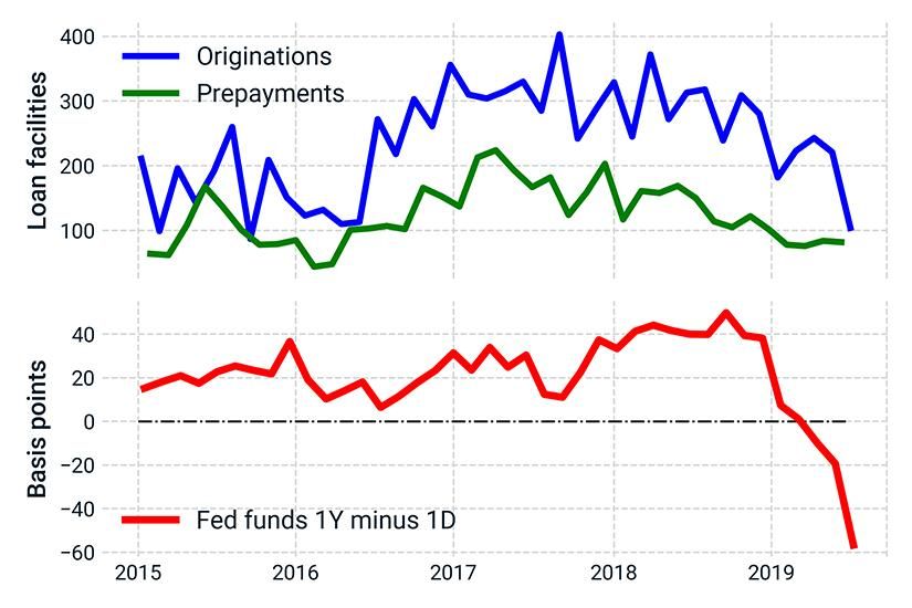Source: IHS Markit. The bottom panel is a measure of the expected path of monetary policy, while the top panel illustrates the number of facilities prepaid and originated in the leveraged-loan market. Market participants are concerned that the recent dovish turn by the Federal Reserve will undermine the attractiveness of floating-rate loans relative to fixed-rate high-yield bonds.