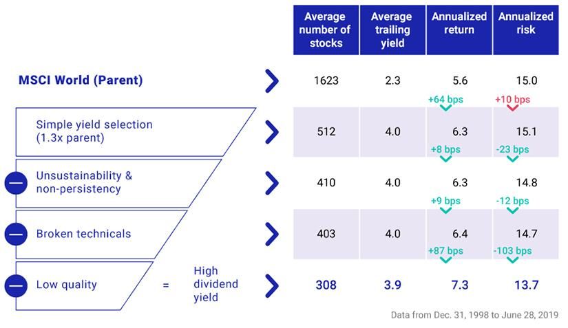 Screening for potential yield traps may be accomplished by filtering out companies with unsustainable or non-persistent dividend payouts, broken technicals and low quality. To assess the incremental added value of four potential screens, we generated different simulations over the past 20 years using the MSCI World Index as the parent index, each one incrementally building on the one before (see exhibit below). The four screens were:
