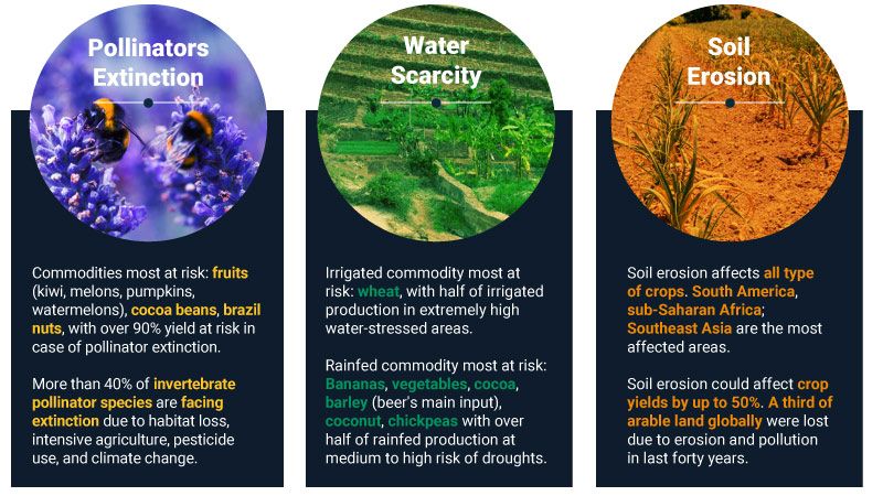 Source: Pollinator extinction; Ritchie, Hannah. "How much of the world's food production is dependent on pollinators?" Our World in Data, Aug. 2, 2021; "The global assessment report on Biodiversity and Ecosystem Services." IPBES, 2016. Water Scarcity: World Resources Institute Aqueduct Food tool, wri.org. Soil Erosion: "Let's #StopSoilErosion to ensure a food secure future." Food and Agriculture Organization of the United Nations, May 15, 2019; Cat, Linh Anh, "Soil Erosion Washes Away $8 Billion Annually." Forbes.com, May 21, 2019.