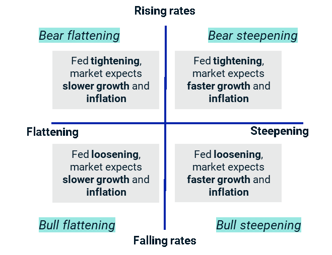 Bear flattening is when short-term interest rates rise faster than long-term interest rates. Bear steepening is when long-term interest rates rise faster than short-term interest rates. Bull steepening is when short-term interest rates fall faster than long-term interest rates. Bull flattening reflects long-term interest rates falling faster than short-term interest rates.