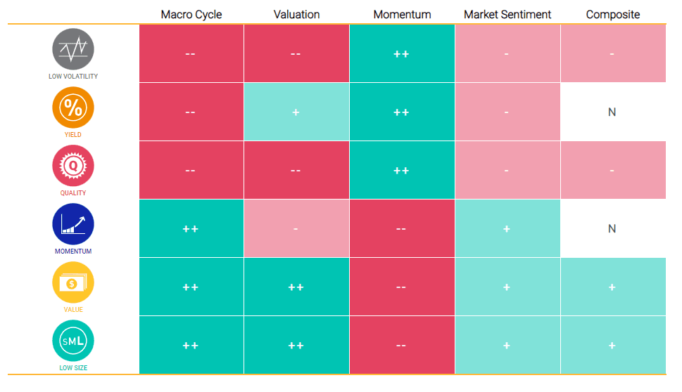 - The macro-cycle pillar indicated an overweight to value, low size and momentum, based on signals from the Chicago Fed National Activity Index, Federal Reserve Bank of Philadelphia's ADS Index and PMI.