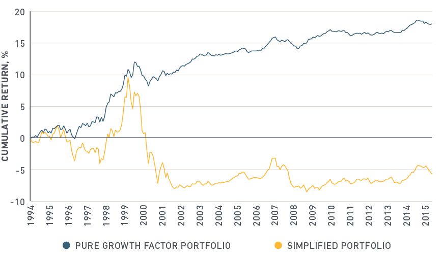 Comparing cumulative monthly returns of these portfolios shows that the pure growth implementation outperformed the simplified approach over the 20-year sample period ending May 2016. So the pure growth factor, net of country, industry and other style factors, earned a premium over our study period.