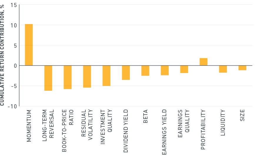 Why was historical performance so dramatically different for the simplified growth strategy? Due to its construction methodology, the simplified portfolio had incidental exposures to style factors other than growth. By selecting stocks that had higher-than-average growth without hedging other style factors, we implicitly chose companies with relatively high momentum, low value, low quality and high volatility characteristics. Taking momentum as an example, the simplified portfolio had a persistent positive exposure to this factor. We also know that the cumulative return of the momentum factor has been positive. This combination results in positive contribution of momentum to the return of the simplified portfolio. In contrast, the negative exposure to value (book-to-price ratio, long-term reversal and earnings yield) and quality (investment quality and earnings quality), and positive exposure to volatility (residual volatility and beta) detracted from returns.