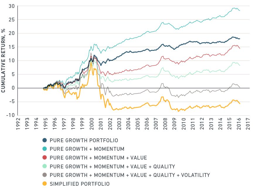 Contributions of style factors to the simplified growth portfolio (1995 - 2016)
