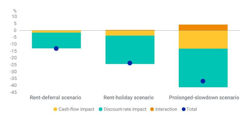 - In the second hypothetical scenario, we model a rent holiday with the same 95% reduction in cash flows over the first six months but the foregone income is not recovered. The risk-free rate falls 50 bps, but the risk premium increases to 7.5%.