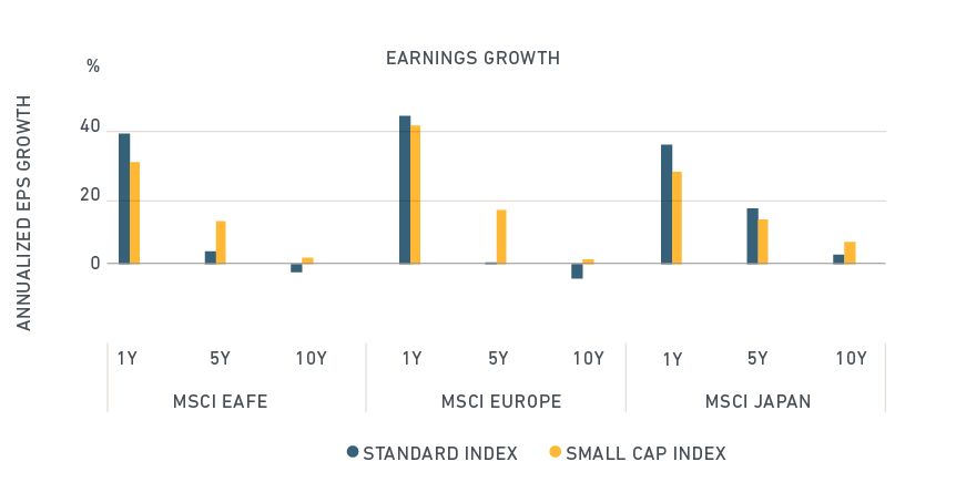 SMALL CAPS' SOLID EARNINGS GROWTH A SIGN OF HEALTHY COMPANIES Importantly, the returns have been due to earnings growth rather than an expansion in earnings multiples. This matters because, as we have demonstrated previously,1 dividends and earnings growth reflect the health of the core business and are the principal drivers of long-term stock returns. Until the last year, the larger European firms struggled to grow earnings. Yet, as the exhibit below shows, smaller European companies showed no signs of malaise. They steadily grew their earnings over the last decade, with double-digit earnings growth since 2013.
