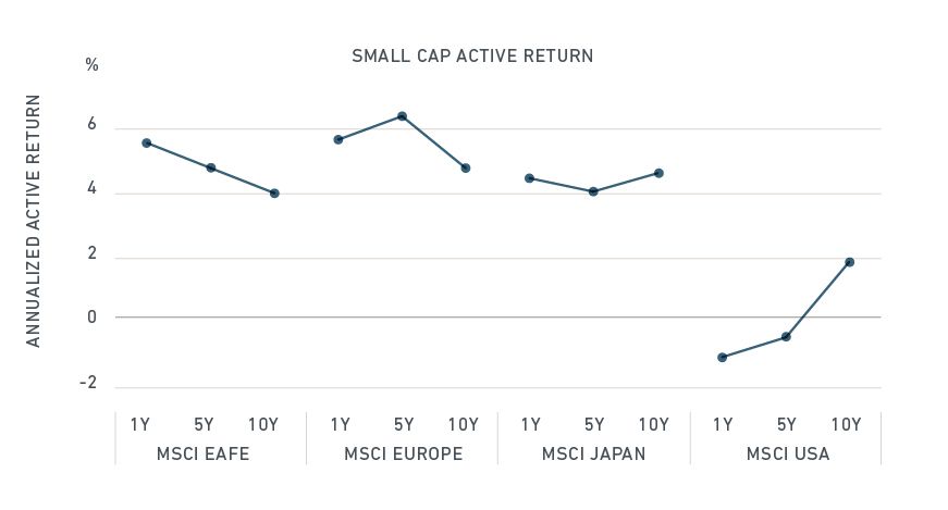 Each point represents the active return of the small-cap against the standard index. Returns are gross in USD and annualized through April 2018.