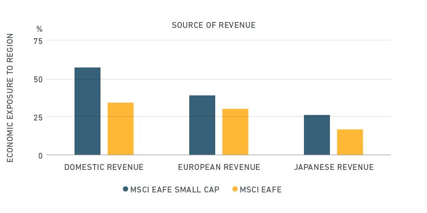 STUDYING SMALL-CAP PERFORMANCE DRIVERS MSCI research showed that firm-specific news is a larger driver of differences in small-cap stock returns than it is for large-cap stocks. This may present opportunities for small-cap active managers focusing on security selection. However, attributes shared across many firms can have substantial effects on indexed strategies, as the style, country and sector makeup of small-cap indexes differs from their large-cap counterparts. We looked at the MSCI EAFE Small Cap Index as one illustration to trace how these differences affected performance for the five years ended April 2018. This index includes over 2,300 companies across developed market countries, excluding the U.S. and Canada, and has approximately $2.6 trillion in market capitalization. Compared to the MSCI EAFE Index, which includes large- and mid-cap firms in the same developed market countries, the MSCI EAFE Small Cap Index was underweight France and overweight Japan. From a sector perspective, it had a large underweight to financials – particularly banks – and an overweight to industrial companies. Weightings are based on the five-year average ended April 2018. SMALL CAPS' SOURCES OF REVENUE ARE LOCAL Smaller firms have tended to generate more of their revenues in their home markets than internationally. This has historically made them more sensitive to their local economies. As shown through the lens of MSCI Economic Exposure below, firms in the MSCI EAFE Small Cap Index generated a higher share of their revenues within Japan and the European market, compared to their large- and mid-cap counterparts. In fact, the active returns of European and Japanese small caps have had a near zero correlation over the past decade.