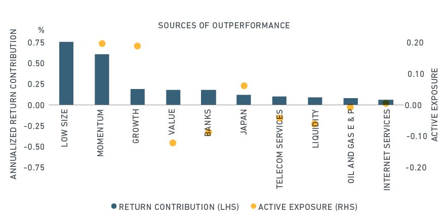 OUTPERFORMANCE EXPLAINED MAINLY – BUT NOT COMPLETELY – BY FACTORS The effect of these differences in revenue sources becomes clear once we examine drivers of return. These are shown below using the lens of the MSCI Factor Classification Standard (FaCS). The top four drivers of outperformance came from factors, led by the low size premium, followed closely by higher momentum. Additionally, small caps in developed markets outside the U.S. and Canada benefited from growth characteristics and relatively expensive valuations. Looking further, we see that factors were not the whole story. The overweight to Japan and underweights to a trio of industries typically rich with multinational firms — banking, telecoms and oil and gas explorers — also drove outperformance.