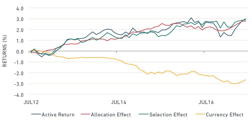 The second exhibit shows that both effects persistently contributed to outperformance over the entire five-year period, with no particular period dominating.