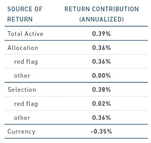 - Allocation effect: Measures the contribution at the group level from a) excluding highly objectionable ("red-flag") stocks and b) increasing the weights of remaining stocks during index rebalancings.