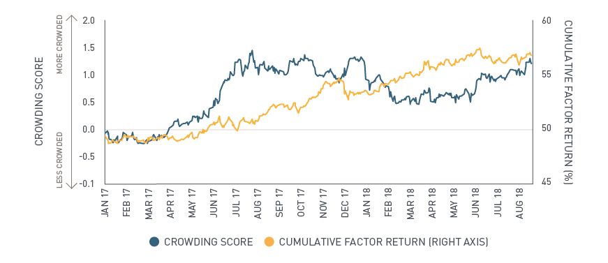 Zeroing in on the period of momentum's recent outperformance, our model measured high levels of crowding during the second half of 2017 and, most recently, between June 1 and Aug. 17, 2018. During the latter period, the momentum factor return was slightly negative, compared to a +3.6% return for the January to May period.
