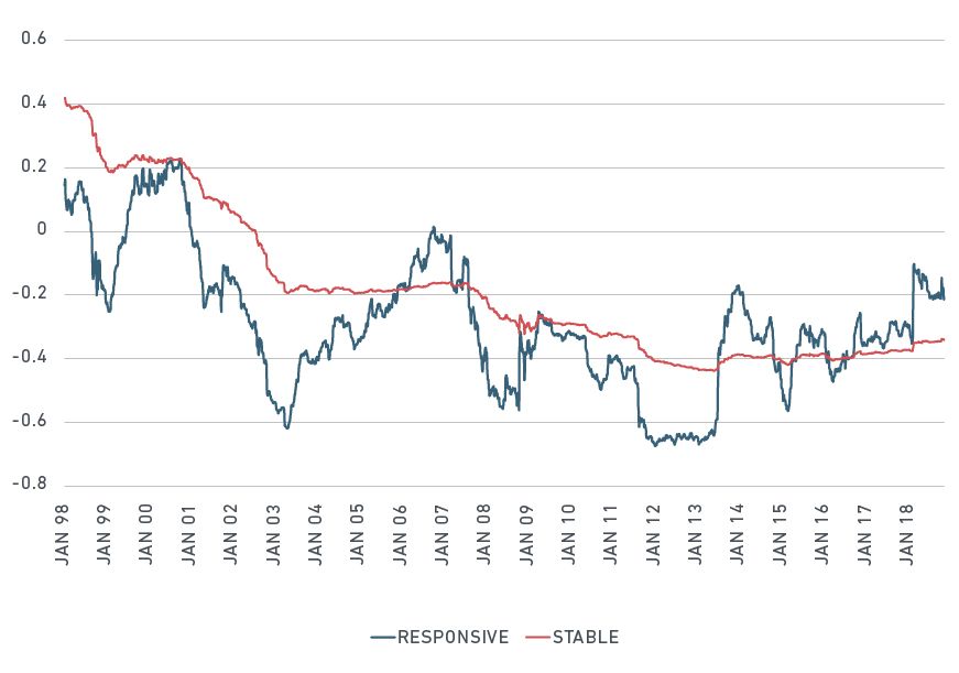 Source: Treasury returns are from the ICE BofAML US Treasury Index (G0Q0), used with permission. Equity returns are from the MSCI USA Index. We used an exponentially weighted moving average (EWMA) correlation estimate with a half-life of six months for the responsive (short-term) view, and with a half-life of three years for the stable (long-term) view. The latter estimate is comparable to the MSCI Multi-Asset Class Factor Model (long model).