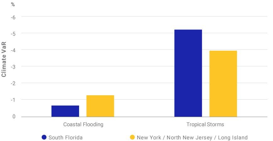 We used the MSCI Real Estate Climate VaR model and a sample of 671 assets from the MSCI U.S. Annual Property Index to evaluate two particularly impactful physical risks: Coastal flooding and tropical storms. All the assets sampled were from either the New York City, North New Jersey, Long Island (NY, NNJ, LI) metropolitan area or the Miami-Fort Lauderdale-Pompano Beach (South Florida) metropolitan area. Each were run under the model's default assumptions.2 The results suggested that, for this sample of institutionally owned assets, the total Climate VaR due to coastal flooding was lower than for tropical storms in both regions. However, there was some difference in the relative size of these two types of physical risks. In this sample, the Climate VaR from coastal flooding was lower in South Florida than in NY, NNJ, LI (-0.7% vs. -1.3%), but the Climate VaR from tropical storm exposure was higher (-5.3% vs. -4.0%).