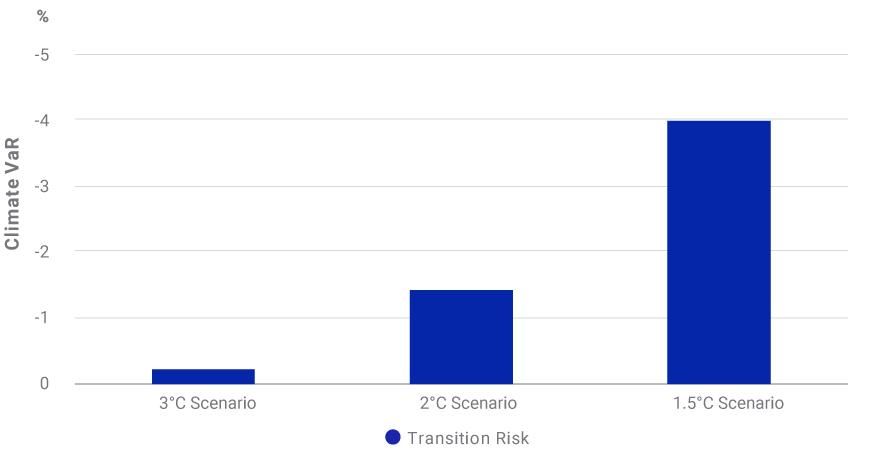 While there may be a temptation to focus on physical risks for real assets, transition risk may play an increasingly important role as well. As the world moves towards a low-carbon economy, there are several potential emissions pathways available, with the required emissions reduction for each pathway being inversely proportional to the amount of warming. For example, limiting warming to 1.5 degrees Celsius would require more drastic cuts than a 2 degrees Celsius scenario which would in turn require more cuts than a 3 degrees Celsius scenario. To illustrate how transition risks may vary, we used the same sample of assets to estimate transition VaR under different scenarios. As we expected, the more aggressive reduction requirements under a 1.5 degrees Celsius scenario resulted in the highest VaR at 4.0%, but even under a 2 degrees Celsius scenario, up to 1.4% of the value in these assets was estimated to be at risk from transition costs, according to our model.