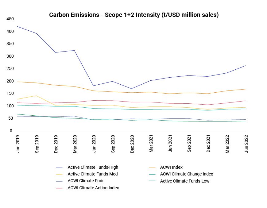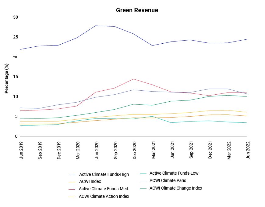 To analyze this in greater detail, we split the active climate funds into three groups, or terciles, every quarter based on their carbon intensity and analyzed each tercile's aggregate carbon intensity reduction and green revenue improvement compared to the MSCI ACWI Index and MSCI ACWI Climate Indexes (as shown below). It was interesting to see the dispersion of the carbon intensity profile for each tercile. While all three terciles demonstrated a significant green revenue improvement compared to the MSCI ACWI Index, the funds with the highest carbon intensity within the selection of active climate funds (active climate funds-high) had a carbon intensity higher than that of the MSCI ACWI Index. This could indicate that they were only targeting higher allocations to green revenues. In contrast, the active climate funds with the lowest carbon intensity (active climate funds-low) relative to the MSCI ACWI Index were at levels similar to that of the MSCI ACWI Climate Paris Aligned Index. These funds probably had dual climate objectives of reducing carbon intensity targeting higher green revenues.