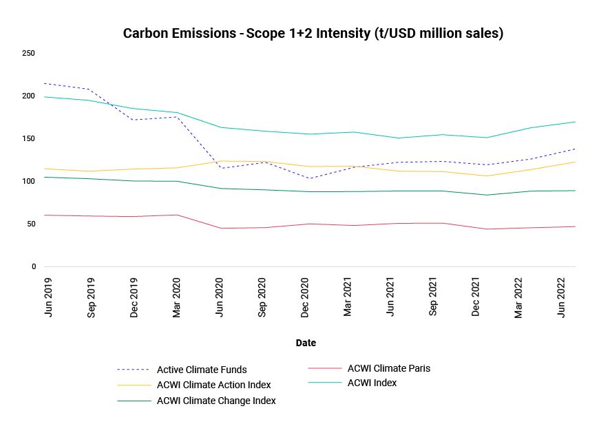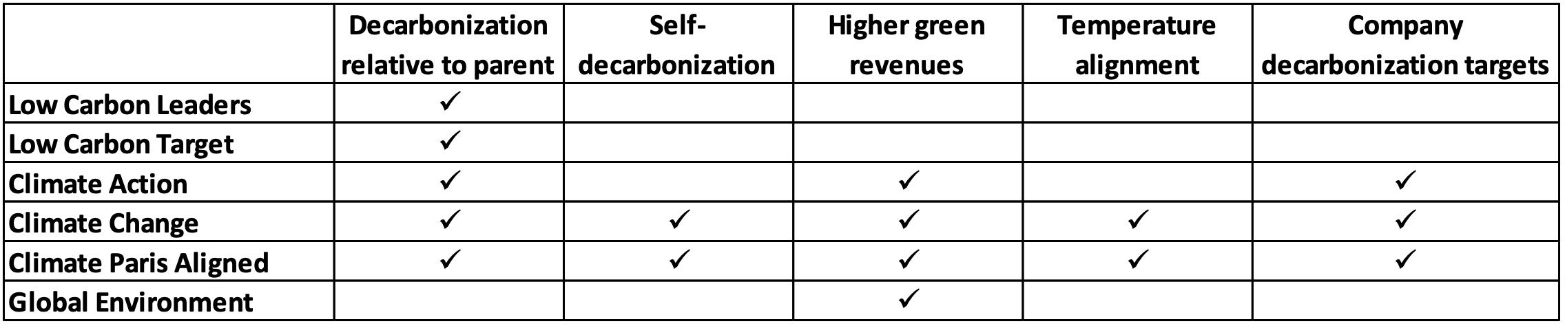 Active climate funds may have a diverse set of climate objectives ranging from targeting low carbon-emission intensity (to reduce transition risk) to higher green revenues (greater allocations to climate solutions). The parallel climate benchmark selection would therefore be dependent on the alignment of climate fund's objectives with the appropriate climate index (see exhibit below).