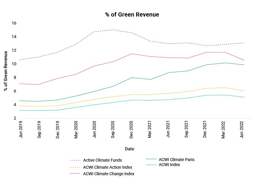 Broad market-cap weighted indexes such as the MSCI ACWI Index or MSCI World Index help define the investment universe and are widely recognized as benchmarks for active climate fund performance evaluation and risk management. As climate investing continues to evolve, active climate funds are exhibiting increasingly diverse climate objectives that range from decarbonization (a lower carbon footprint compared to the benchmark), opportunities associated with low carbon transition (higher allocations to companies with green revenues or operations), temperature scenario alignment or an economy-wide climate transition. While broad market-cap weighted indexes may be useful to assess fund performance, they might not fully assess the alignment of the fund towards its climate objectives. Using a climate index can also help track progress toward achieving climate objectives.