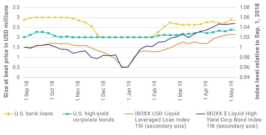 Source: MSCI analytics based on IHS Markit data. Depth at best price for U.S. bank loans and high-yield corporate bonds (weekly data points, 15-day median). Relevant index levels, relative to their values on Sept. 1, 2018, are shown on the secondary axis.