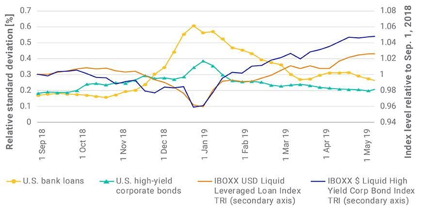 Source: MSCI analytics using IHS Markit data. Quoted price uncertainty for U.S. bank loans and high-yield corporate bonds, defined as the relative standard deviation of quoted prices (weekly data points, 15-day median). Relevant index levels, relative to their values on Sept. 1, 2018, are shown on the secondary axis.