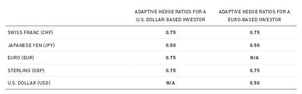 Based on the adaptive hedging methodology, a U.S.-based institutional investor would hedge 75% of their Swiss franc exposure, 50% of their yen exposure, 75% of their euro exposure and 75% of their sterling exposure. Similarly, an investor based in the eurozone would hedge 75% of their Swiss franc exposure, 50% of their yen exposure, 75% of their sterling exposure, and 50% of their U.S. dollar exposure.