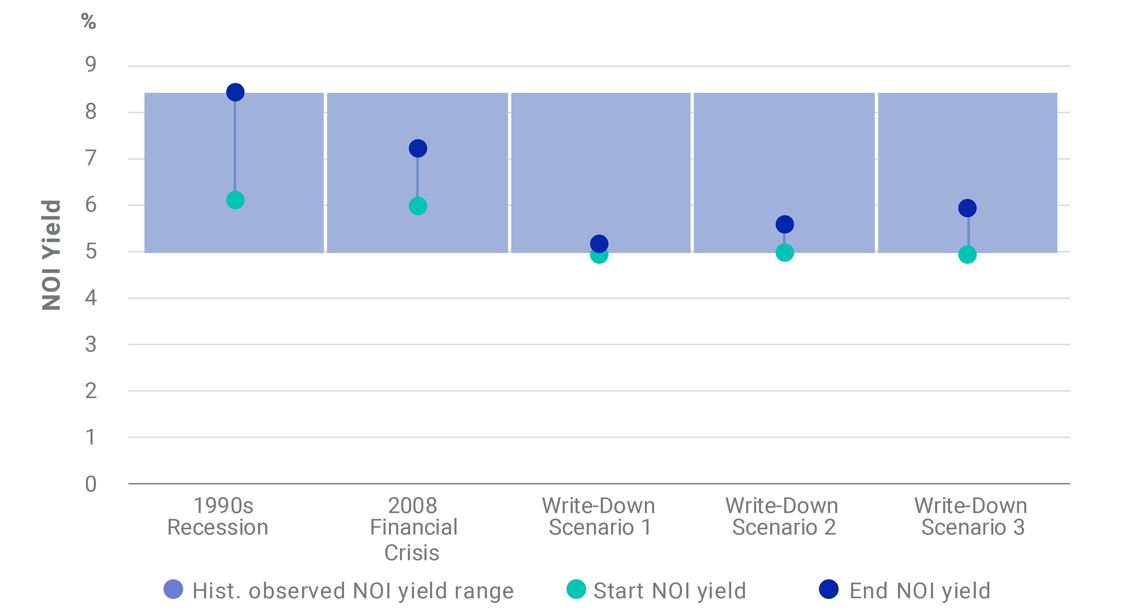 Unnamed: 0 End NOI yield | 1990s RECESSION 8.4% | 2008 FINANCIAL CRISIS 7.2% | WRITE-DOWN SCENARIO 1 5.2% | WRITE-DOWN SCENARIO 2 5.6% | WRITE-DOWN SCENARIO 3 5.9% |