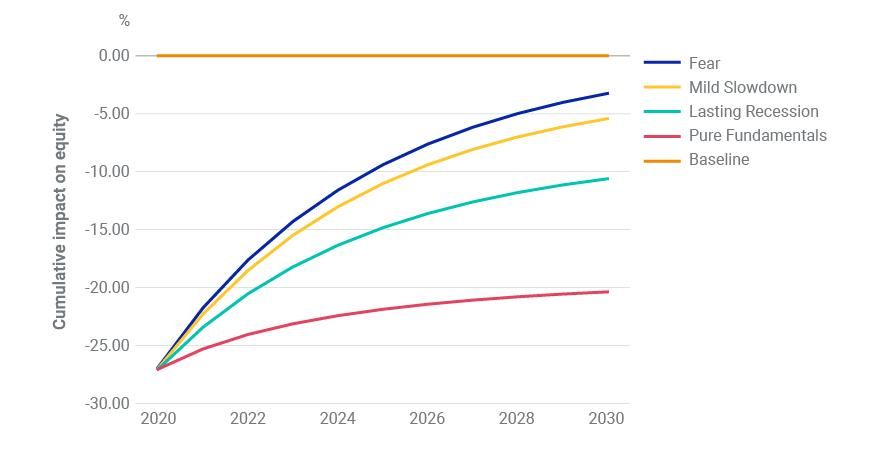 Scenario "Pure Fundamentals" | Feb. 21 to March 12 MSCI USA Index -27% | Change in short-term growth rate -3.5% | Change in long-term growth rate -3.5% | Change in risk premium 0 |