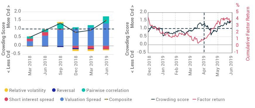 As of June 2019, U.S. price momentum was crowded again (with a crowding score of 1.5), even after having moderated when markets sold off in 2018 and suffered a sizable pullback in the first four months of 2019. Meanwhile, historical beta, which was crowded at the end of last year, fell to 0.7; and residual volatility and earnings yield came off high uncrowded levels (near -1.0) at the end of last year, but were still moderately uncrowded as of the end of June.