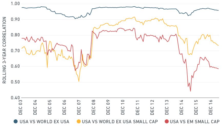 1) Correlation: In an environment where asset classes have become increasingly correlated, small caps have helped diversify portfolios. As shown below, while correlations between the MSCI USA and World ex USA indexes (which include large- and mid-cap stocks) remained relatively high (dark blue line), adding global small-cap stocks to the mix has would have lowered the correlation.