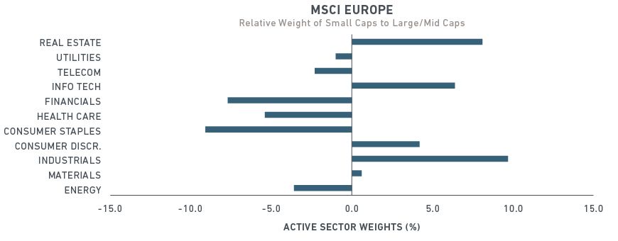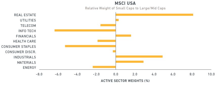 2) Sector tilts: In general, small caps have smaller economies of scale than larger firms. We analyzed small-cap indexes using GICS® sectors1 and found they are light on energy, telecom and consumer staples stocks, which require a large capital base more characteristic of large- and mid-cap companies.