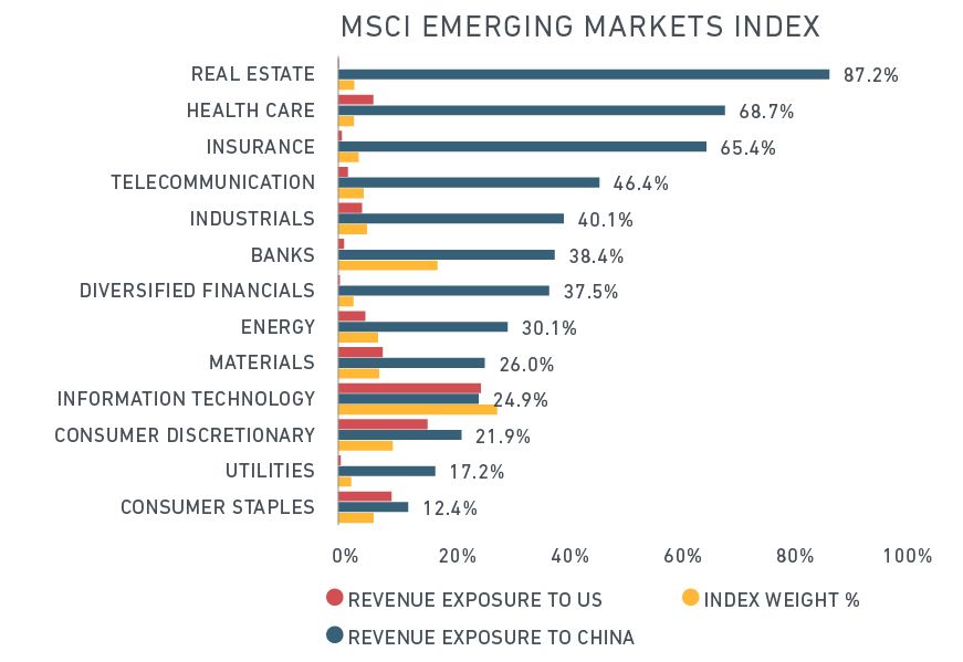 The exhibit below shows that international developed markets have more exposure to the U.S., overall, especially within the healthcare and consumer discretionary sectors, though they are more dependent on China within real estate. Emerging markets and Asia ex Japan are more exposed to China by wide margins across all sectors, with the exception of information technology and consumer discretionary where the differences are smaller.