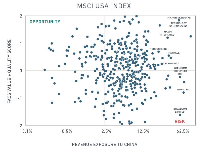 1 Please note: Our conclusions are based on the MSCI China Index, which does not contain many of the unlisted Chinese companies in affected sectors, or revenue exposure data for China A shares. Many of China’s exports to the U.S. are finished goods manufactured with supplies from companies outside of China, which is one reason the Chinese firms’ direct revenue exposure to the U.S. is not as high as suggested by the aggregate export figures.2The average of the MSCI FaCS Value and FaCS Quality scores at single stock level quantifies a stock analyst’s view to pick stocks based on a combined assessment of valuations and the fundamental strength of firm financials. See Creating a common language for factor investing on definitions and case uses of MSCI FaCS.