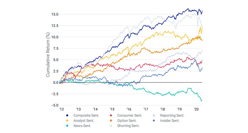 There are many dimensions of sentiment — some are based on the actions or views of influential and potentially well-informed market participants, such as short sellers, options traders, sell-side analysts, institutional investors and corporate insiders. Others may be different types of influencers, such as news and social media, company employees and consumers of a company's products.
