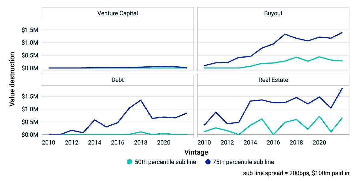 For venture capital, where sub lines are rare, costs are predictably low. A meaningful fraction of private-debt sub lines costs LPs 1% of paid-in capital by relying on these facilities. In buyout and private real estate, value destruction rising above 1% of paid-in reflects both the growth in sub-line deployment and higher interest rates.
