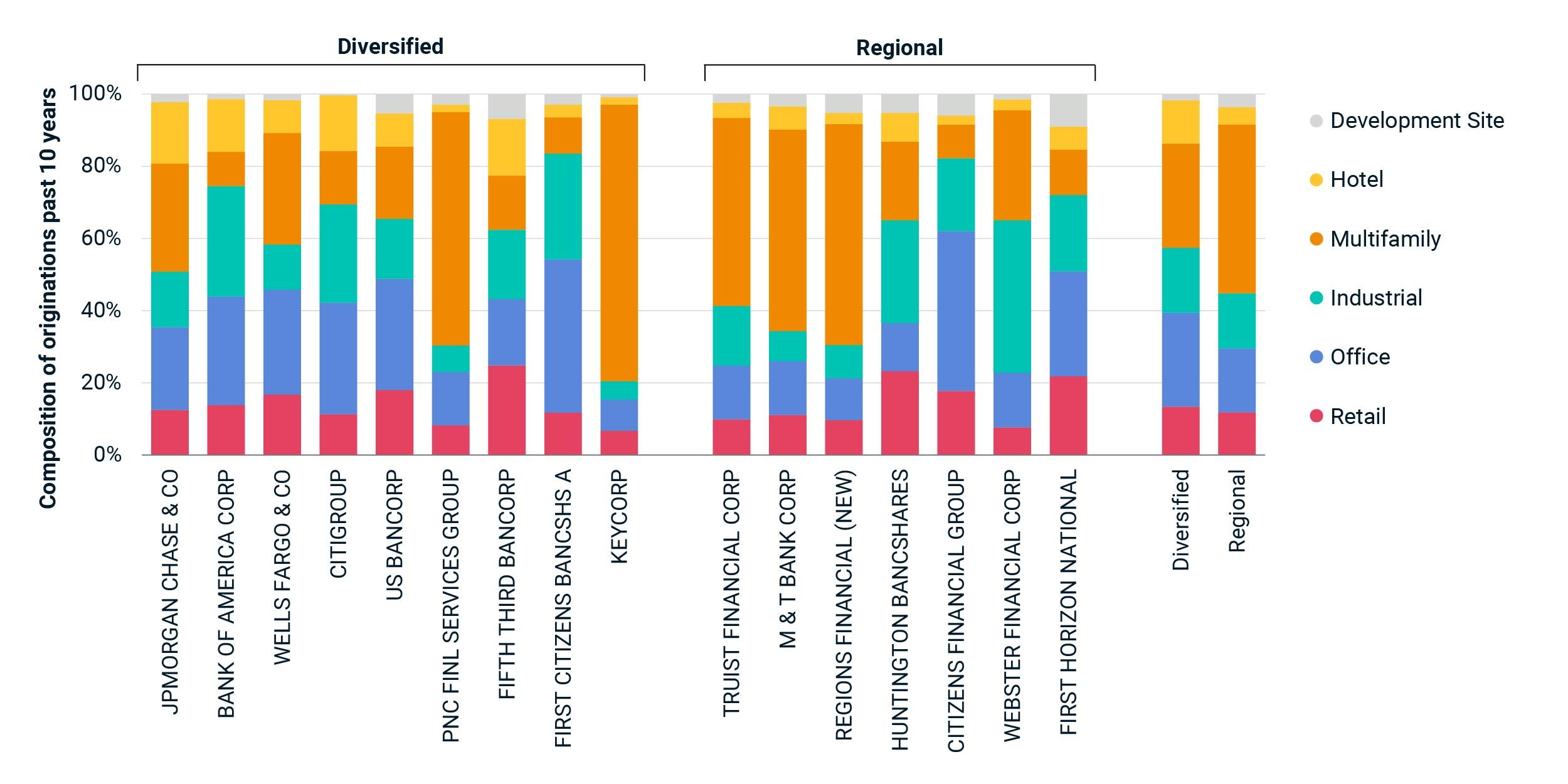 These regional banks were less active in office lending over the last decade, with only 18% of their originations in office, compared to 26% for diversified banks. Regional banks also originated a lower share in retail, industrial and hotels. They were more active in multifamily, with 47% of their volume in this property type, compared to 29% for diversified banks.