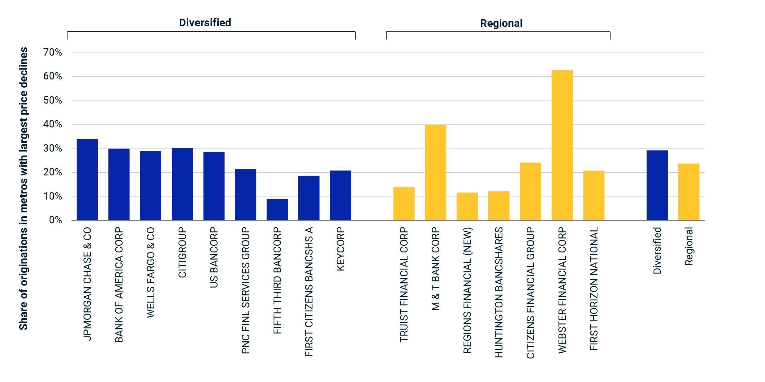 Looking at more recent originations and by geography, in the last 24 months diversified banks originated 29% of their volume in the 10 metros that recorded the largest overall price declines in the past year.4 Regional banks originated 24%, though shares varied significantly across the individual banks analyzed. Mortgages originated in these markets recently may be more vulnerable due to declining asset values.