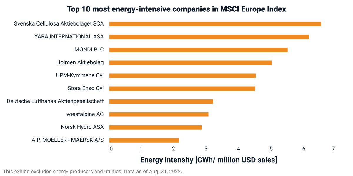We looked at the energy exposure of stocks in the MSCI Europe Index. First, we identified the most energy-intensive companies measured in terms of energy consumption in gigawatt hours (GWh) per USD 1 million of sales.1 We only included companies whose assets are predominantly located in Europe, with the top 10 most energy-intensive companies outside of energy producers and utilities shown in the exhibit below. In the absence of offsetting government subsidies, high energy costs could significantly reduce these companies' profit margins.