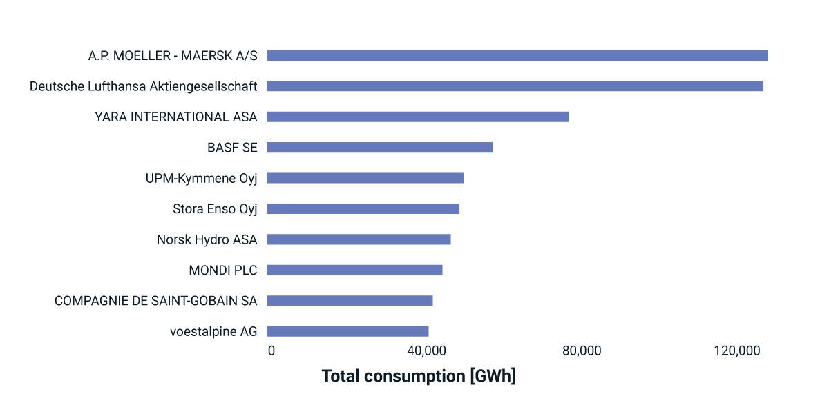 Next, we assessed companies with the largest absolute energy consumption, measured in GWh. These companies might be at risk if European governments seek to cut energy use.2