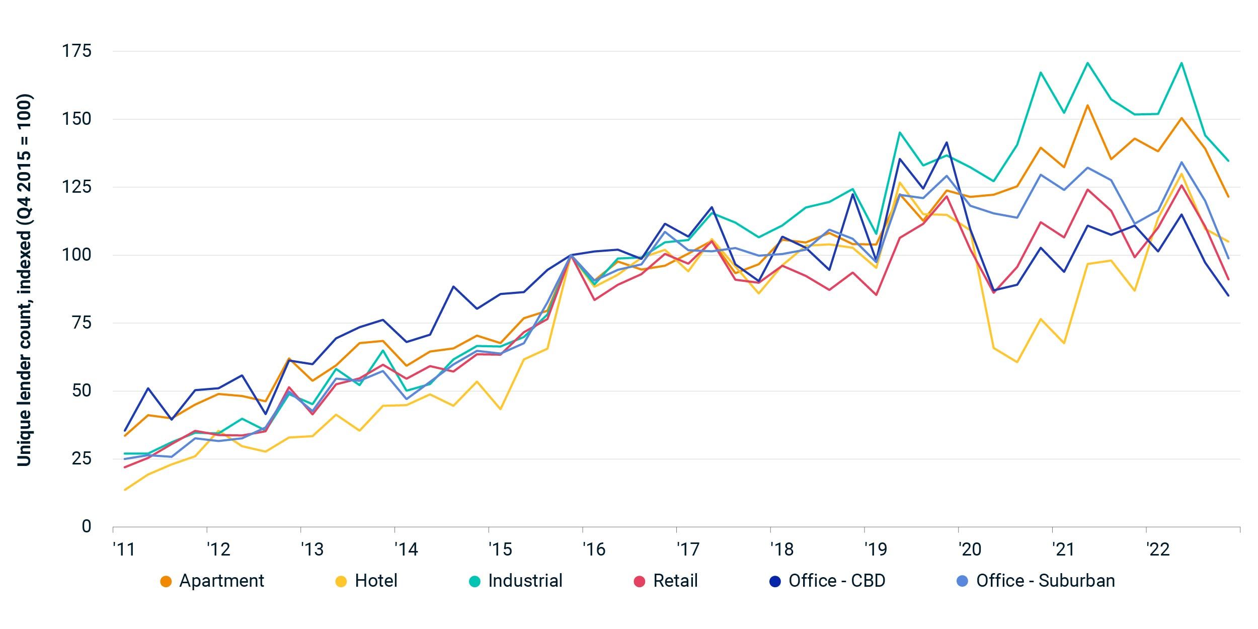 Across all property sectors, there were 7% fewer unique lenders active in the market in the fourth quarter of 2022 than in the final quarter of 2021. Some sectors showed a sharper decline: The size of the lender pool for apartment and industrial fell at double-digit rates. The hotel sector, by contrast, had a 21% increase in the number of active lenders, though this sector had been hit harder previously by the pandemic, causing many lenders to pull out.