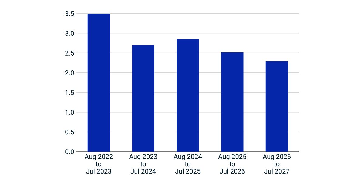 Signals from the bond market show what some investors consider a remarkably optimistic inflation outlook. As shown in the chart below, next year's Treasury-market-implied inflation rate was 3.5%, as of the market close on Aug. 10. In the following year, this rate fell to 2.7%, and by year five to 2.3%, close to the Federal Reserve's long-standing 2% inflation target.