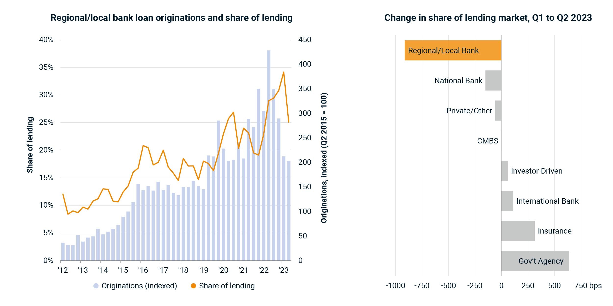 The failures of Silicon Valley Bank, Signature Bank and First Republic early in 2023 cast a cloud over the lending behavior of other regional/local banks. There was a 53% year-over-year decline in commercial-mortgage originations by smaller banks in Q2 of 2023, according to MSCI Mortgage Debt Intelligence.
