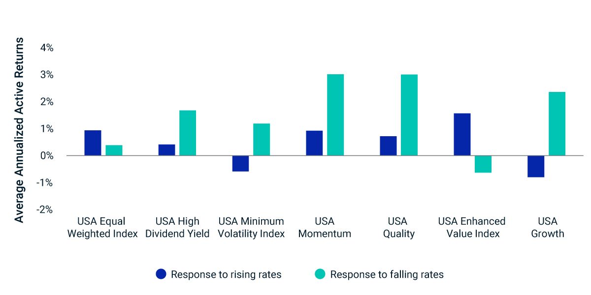 We found that growth, and to a lesser degree minimum-volatility, stocks underperformed a market-cap-weighted benchmark during periods of rising rates. All other factor indexes delivered positive active returns, relative to their benchmarks, when rates rose. Value and lower-sized stocks (the latter proxied by the MSCI USA Equal Weighted Index, which has higher exposure to smaller companies) have done better during rising-rate environments, compared to periods when rates were falling.
