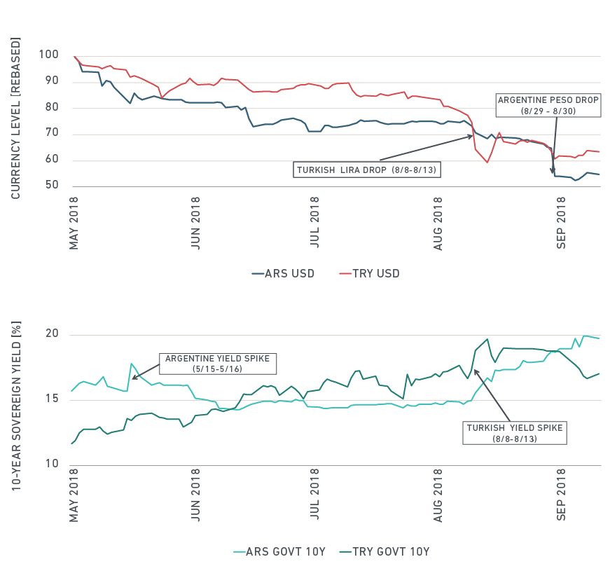 The 1997 Asian financial crisis provided a vivid lesson in how a problem in one country can quickly spread to seemingly unrelated markets. More recently, a few sharp moves in the sovereign yields and currencies of Argentina and Turkey made investors nervous about other emerging-market exposure (see exhibit below).