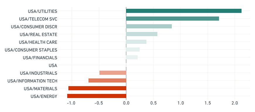The sell-off was not indiscriminate. Although all sectors registered negative absolute performance, we saw clear evidence of flight to safety. Using sector indexes as market proxies, we see that defensive sectors such as utilities and telecom outperformed while cyclical sectors such as energy, materials and information technology fell more than the market.