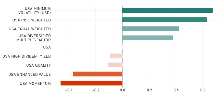 We observed similar patterns of performance across equity factor indexes. Low volatility indexes outperformed while value and momentum indexes fell sharply and underperformed the broad equity market. One unusual feature of this sell-off is that large-cap stocks dropped more sharply than mid- and small-cap companies, resulting in outperformance for the MSCI USA Equal Weighted Index. The MSCI USA Diversified Multiple Factor Index, a proxy for fundamental strategies that favor stocks with low size, value and quality characteristics, fared relatively well during the sell-off.