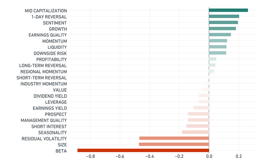 When Lehman Brothers declared bankruptcy on Sept. 15, 2008, the U.S. market factor had a 3.8 standard deviation drawdown, similar in magnitude to Black Monday. Beta and residual volatility factors also registered sharp negative returns that day. Also, the leverage factor fell by five standard deviations, underscoring the severe impact of the credit crunch on highly leveraged companies.