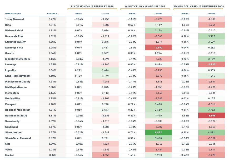 To put factor performance in a historical context, we focus on one-day returns and calculate z-scores by dividing with daily factor return volatility, calculated over the period June 30, 1995 to Feb. 5, 2018, the longest period for which we have daily factor return data. Then we compare standardized daily factor returns from Feb. 5, 2018 (Black Monday) against two previous instances of extreme market conditions: the Quant Crunch on Aug. 8, 2007 and the collapse of Lehman Brothers on Sept. 15, 2008.